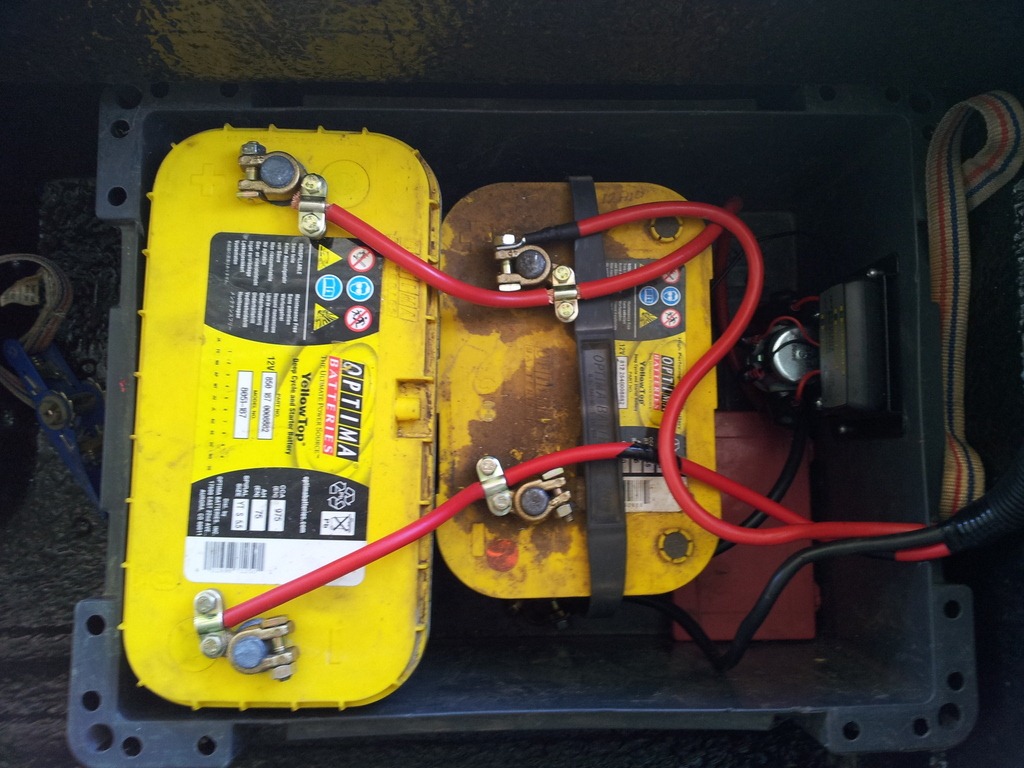 I had 5 Optima Yellow Tops from the Disco and the trailer . I decided to use 4 as auxiliary batteries and also replaced the starting battery with one . I used a National Luna battery management system and a Link 10 for monitoring . As I had already removed the camper to have the load bay rubberised , it was quite easy to get to everything .