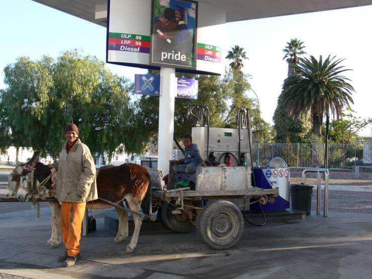 I was standing in the check-out queue waiting to pay when my attention was drawn by a sudden burst of noise and activity outside on the forecourt. Through the window I saw that donkey and cart were pulled up alongside the pumps for “refuelling”. The donkey had its nose in the watering can generally used to top up cars, and the cart passenger was swabbing down the poor creature’s sweaty flanks with the squeegee thing usually used to clean windscreens and score a bigger tip. The driver and passenger were having an extremely loud and colourful conversation, none of which I could understand apart from the “voks” and “jou ma” comments, but which must have been extremely funny judging by the toothless guffaws.