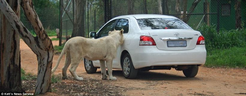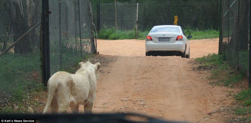The drama was played out at Lion Safari Park in Johannesburg, South Africa, and captured on camera by British tourist Richard Holden, who was in the car behind.