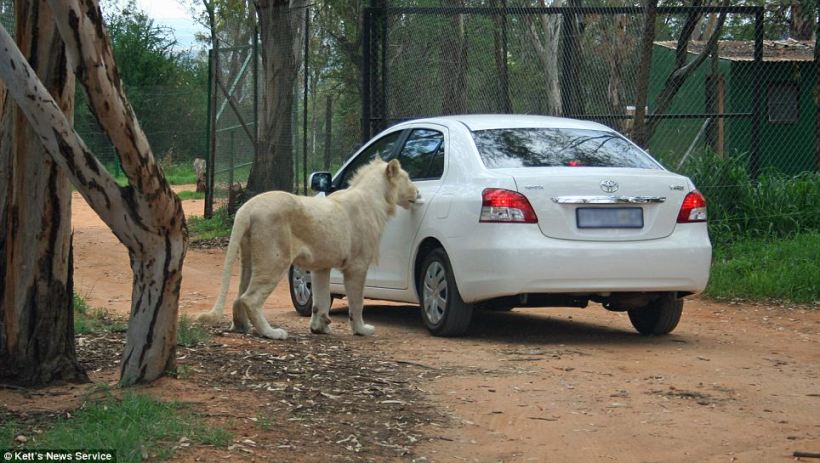 Outta here: The lion looks on as the car it was trying to get into zooms away