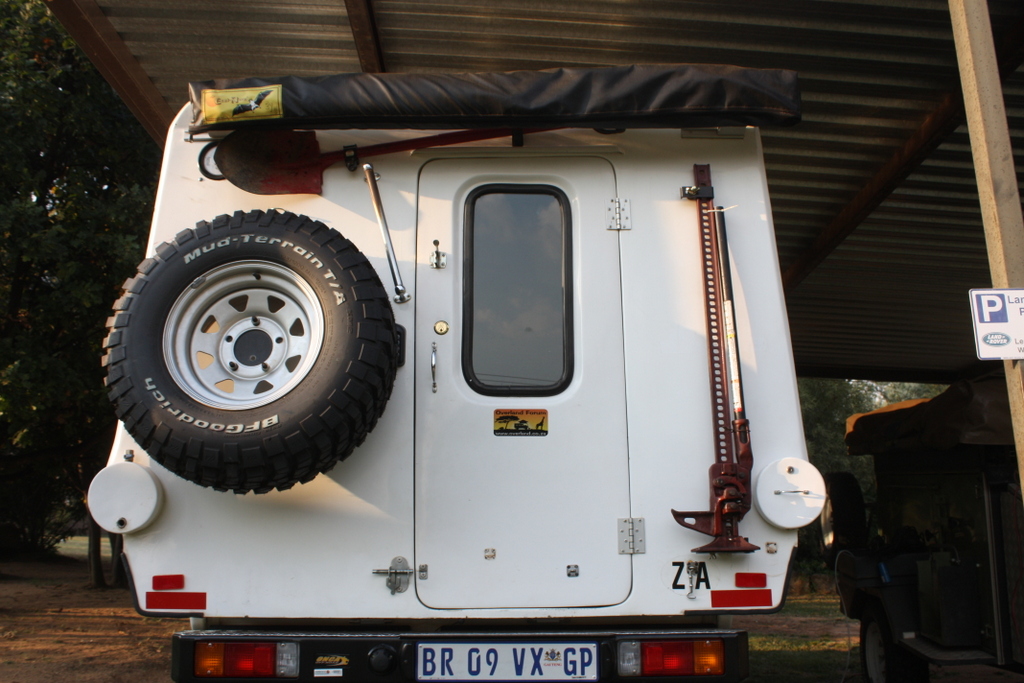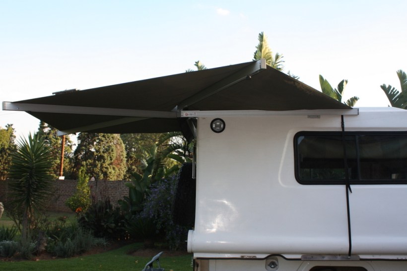 This is a custom made Batwing Awning from Eazi-Awn , as the standard one was too long. It normally is mounted on the side of the vehicle , but I wanted it on the back , as I was worried about it being knocked off . This has meant that it unfortunately doesn’t provide much cover , but it is good enough to shelter the back door and stove area .