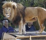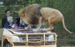 This is the Werribee Open Range Zoo in Victoria , Australia and only the hood of the car is outside the glass cage with lions. The rest of the car is on the inside.