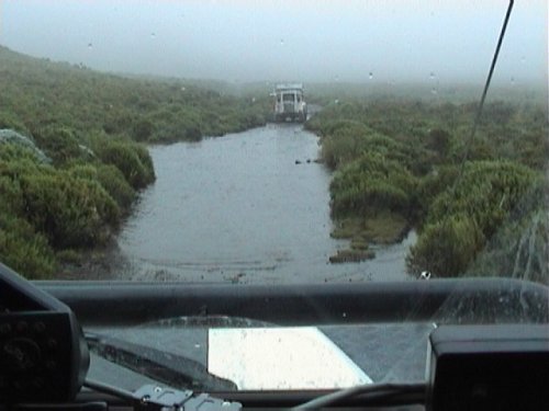 We decided to turn around and head back up the pass , camping at a section of flat road we had seen earlier . We camped the night in poring rain , and headed out quite easily the next day to our starting point , as we had done a lot of road building the previous day .