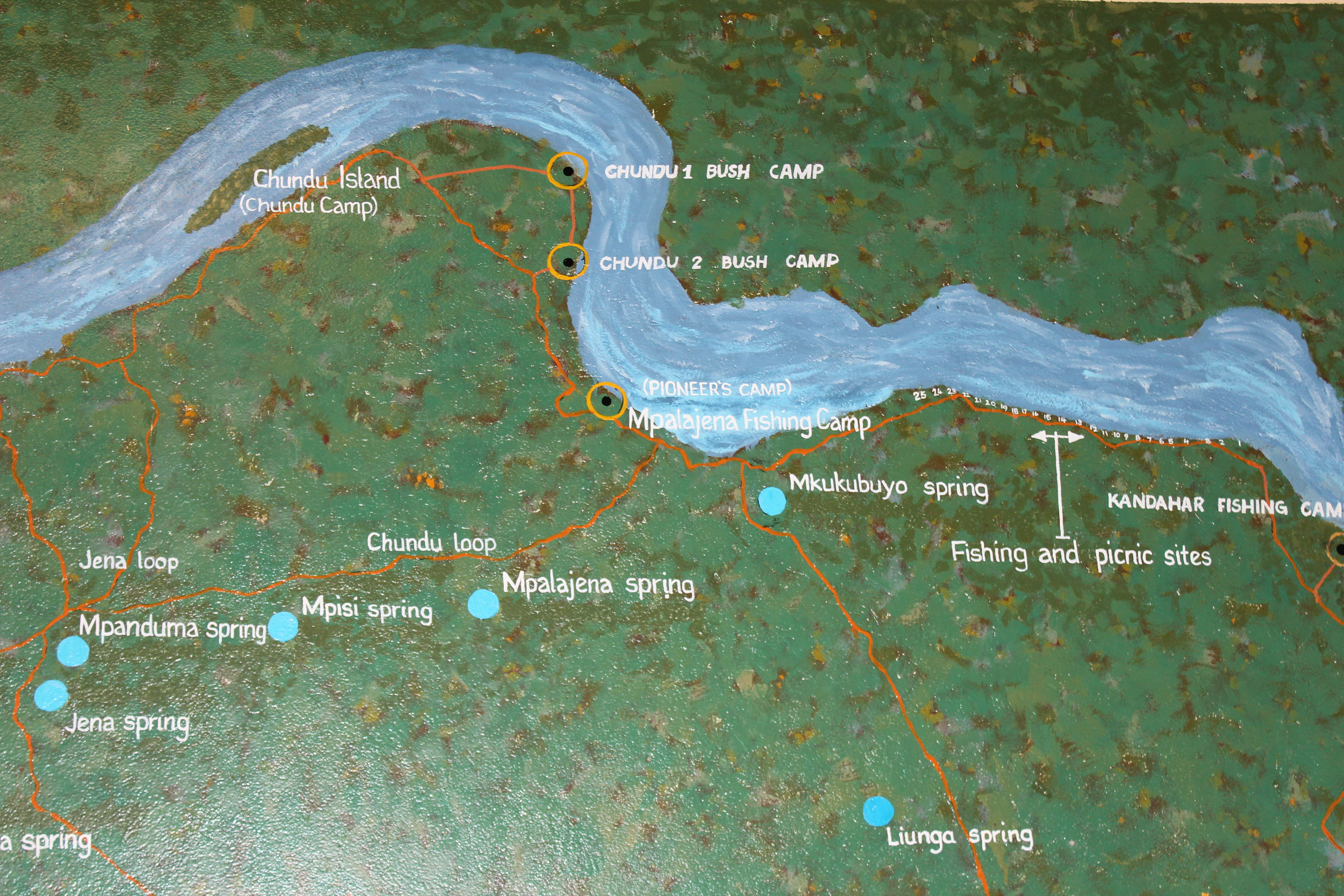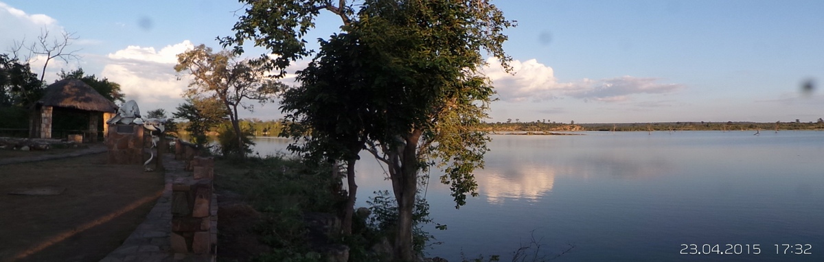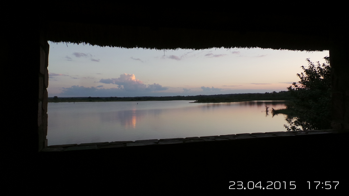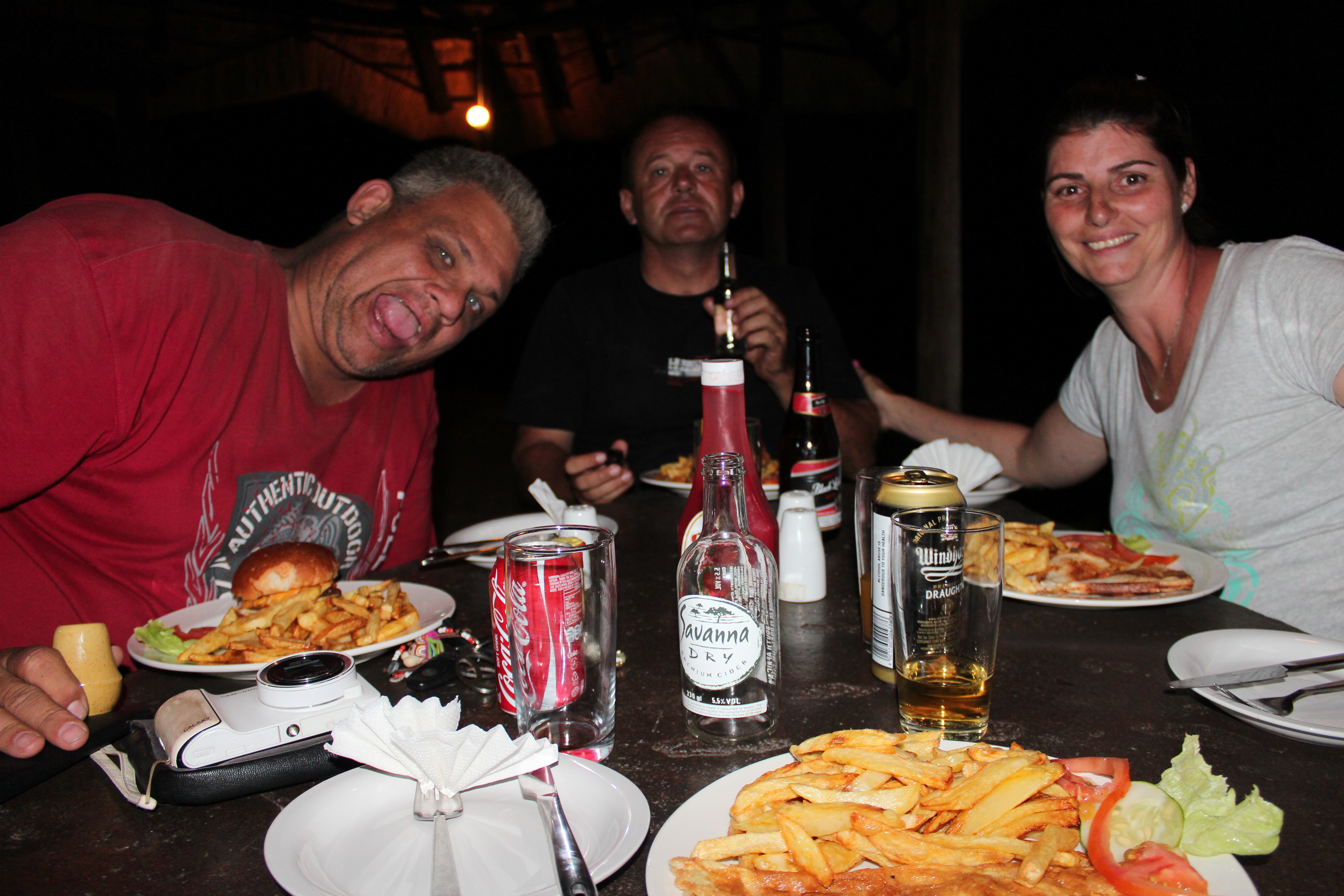 Later in the day we went for an exploratory drive around the north western side . There are quite a couple of nice secluded areas , but we didn’t get very far , because once you are off the main roads , the other are in quite bad shape . We headed back to the campsite , and decided to patronise the restaurant again for supper . There was a group of about 12 Eastern European guys who appeared to be staying in the chalets . It looked like something that had been organised via Vic Falls .