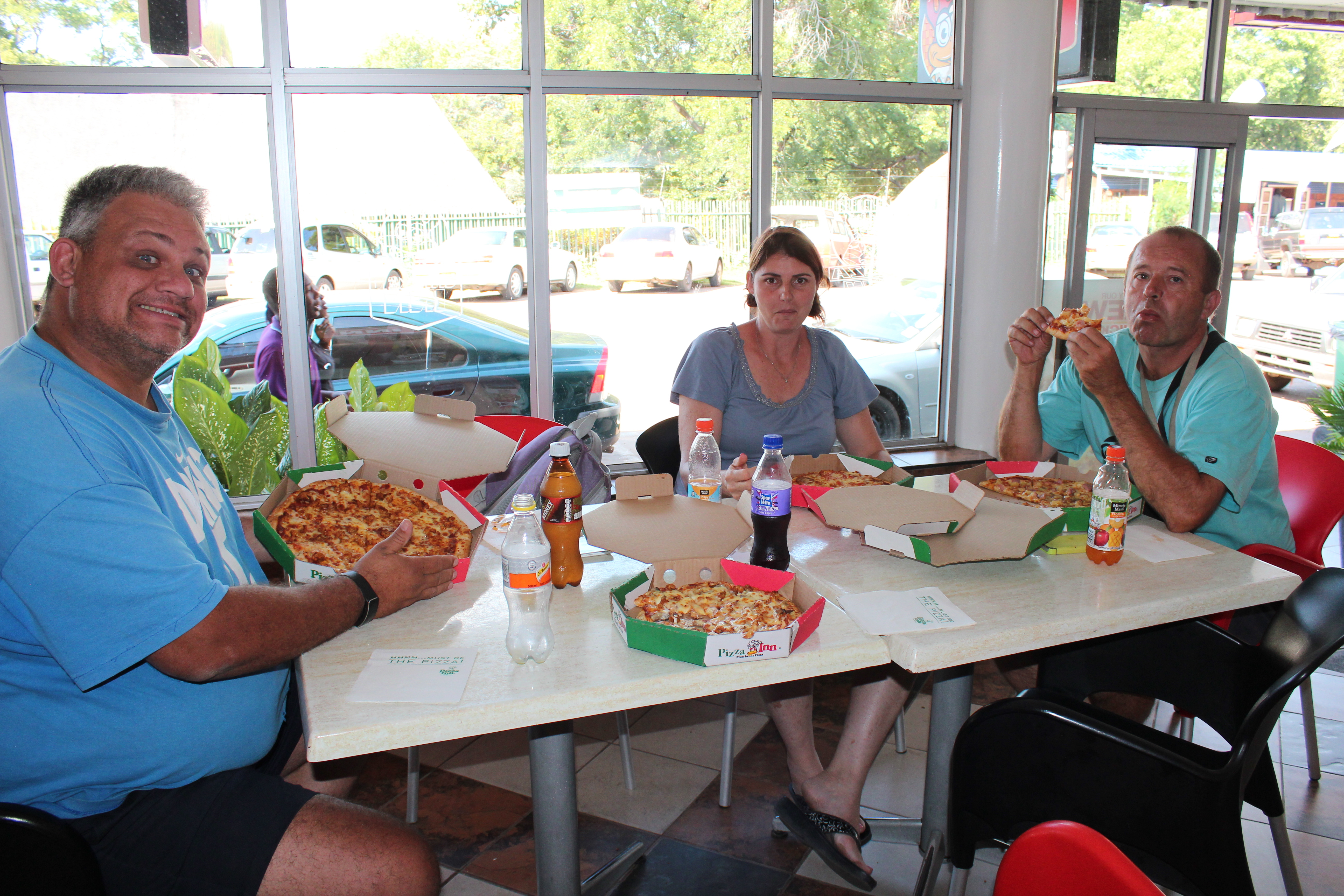The first thing we did when we reached Vic Falls (other than to try get Phillips tire repaired , as he was now without a spare , and in his words ,not mine , “Dena wouldn’t stop bleating about it :-)”. We found a tyre repair shop that suggested he put a tube in the tyre as the sidewall was too damaged. He said we could collect it the following day , as he had to first source a tube) was to head for a pizza next to Shearwater . This was turning out to be quite a culinary expedition.