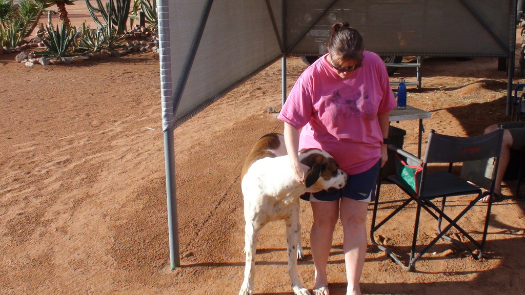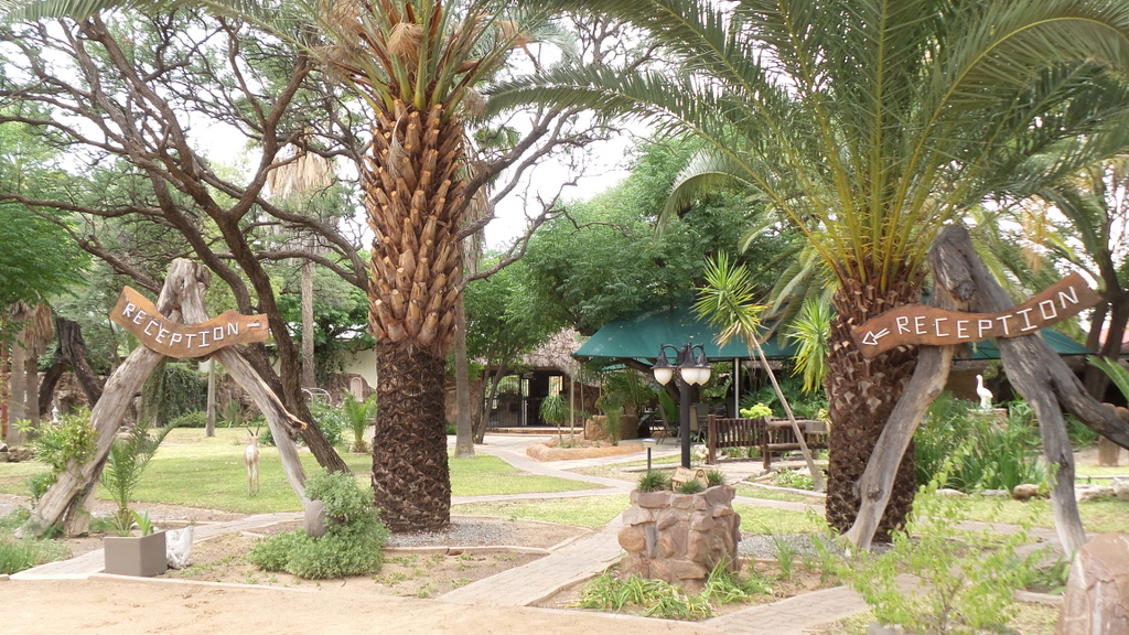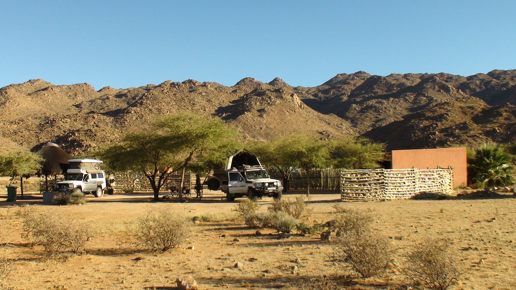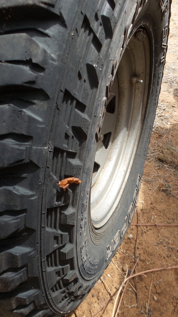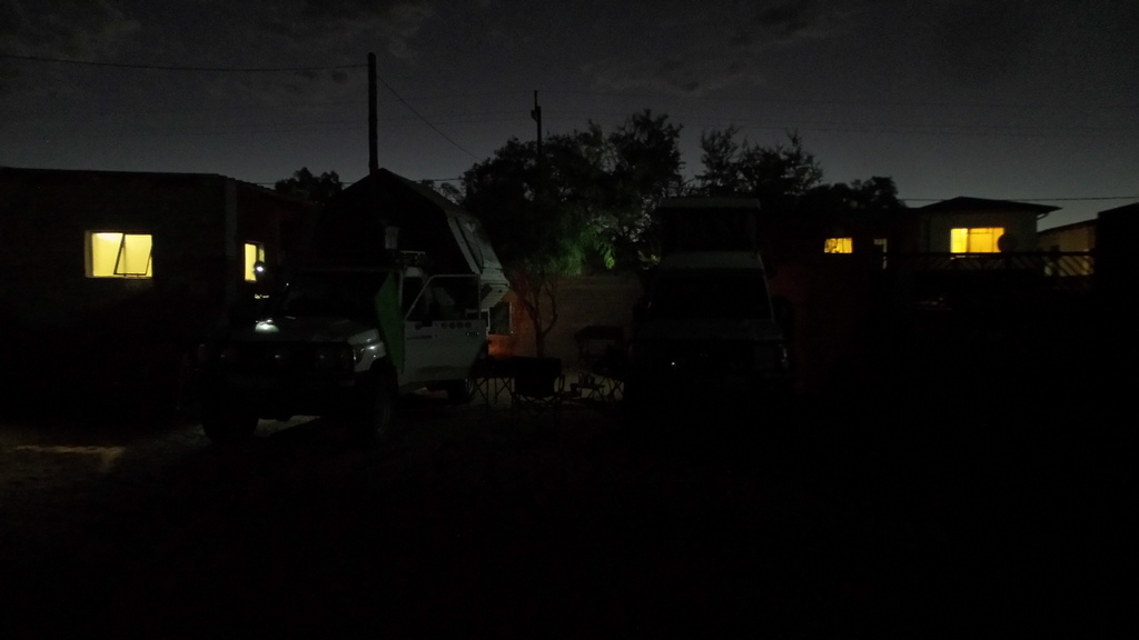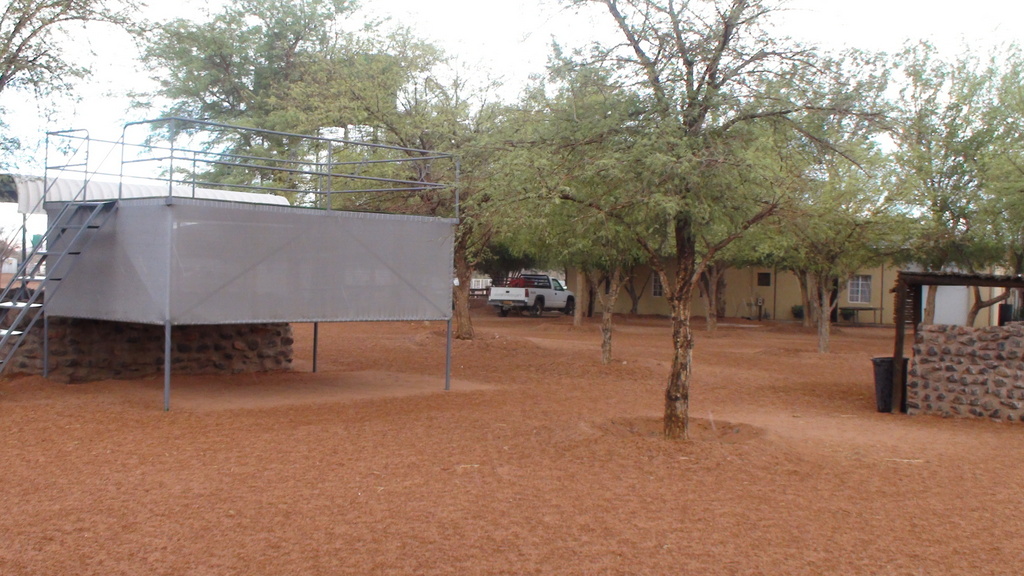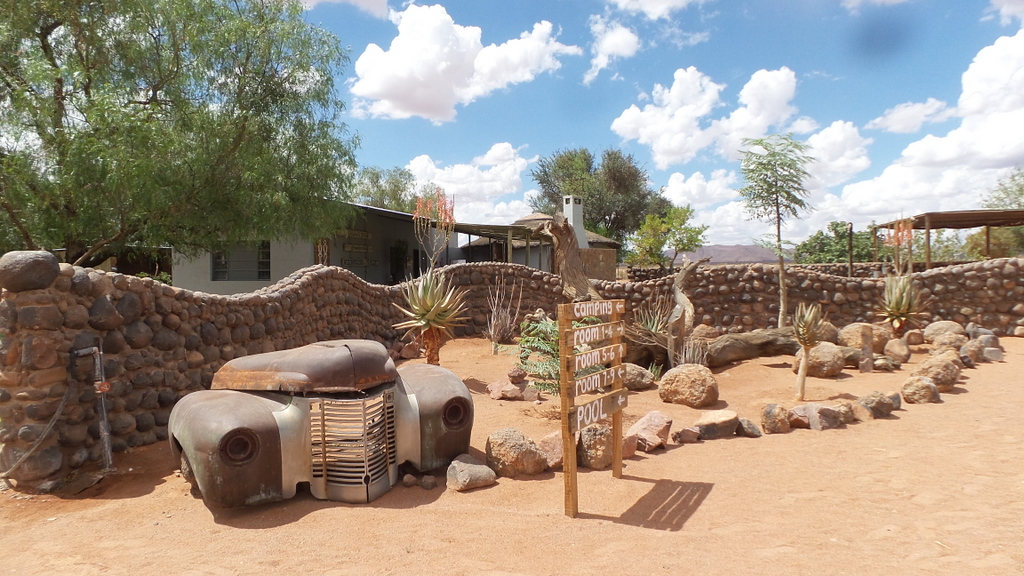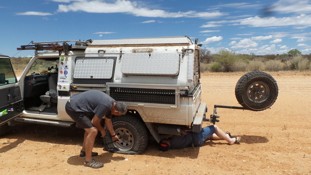 Lunch over , we headed towards Windhoek , where we would fins somewhere to stay for the night . Unfortunately we didn’t get very far before the tyre went flat again. I decided to put on the spare and get someone to look at the tyre once we reached Windhoek. We decided to stop at Ondekaremba Farm next to Windhoek Airport for the night. The campsite was full , but they allowed us to camp next to one of the chalets and gave us the keys so that we could use the bathroom .