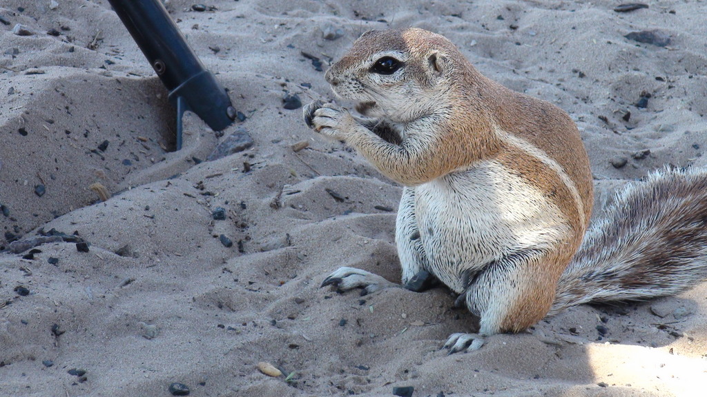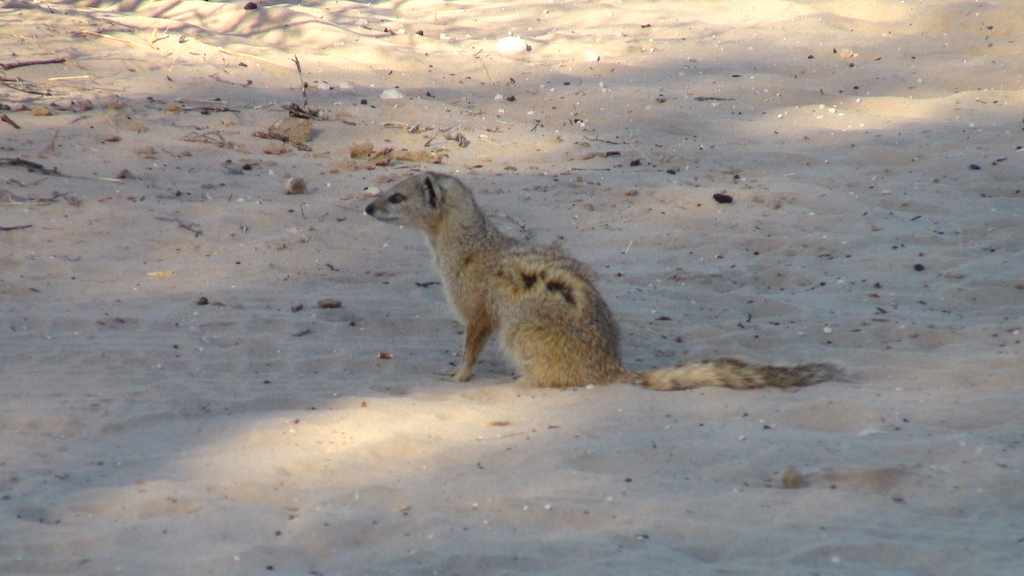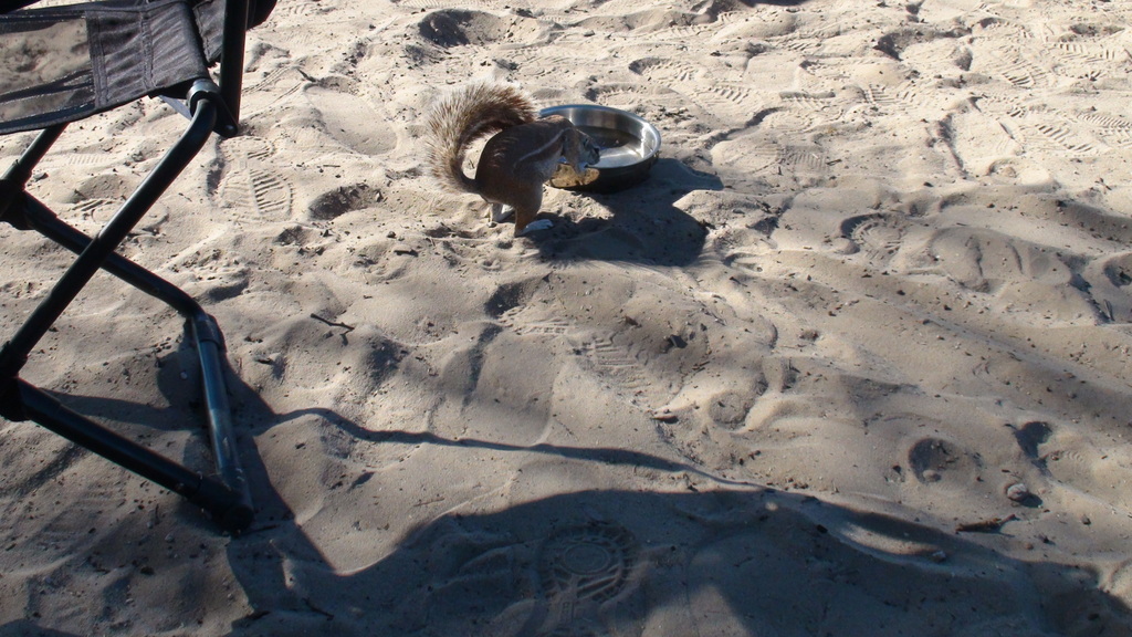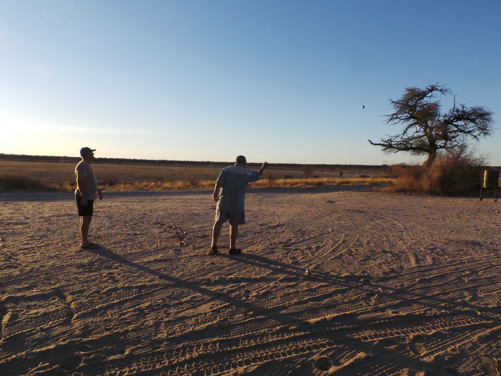 We took a slow drive to the camp-site on Lesholago Pan and were pleasantly surprised to see that the shower was working , and that the long drop was bearable – for some of us – Phillip still chose a spade. We spent the rest of the day in the camp ,played some Boules (which I naturally won) and where visited by squirrels , a yellow mongoose and hyena that night while we were sitting around the fire .