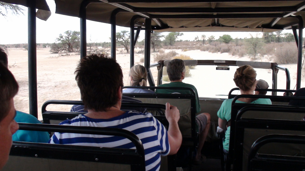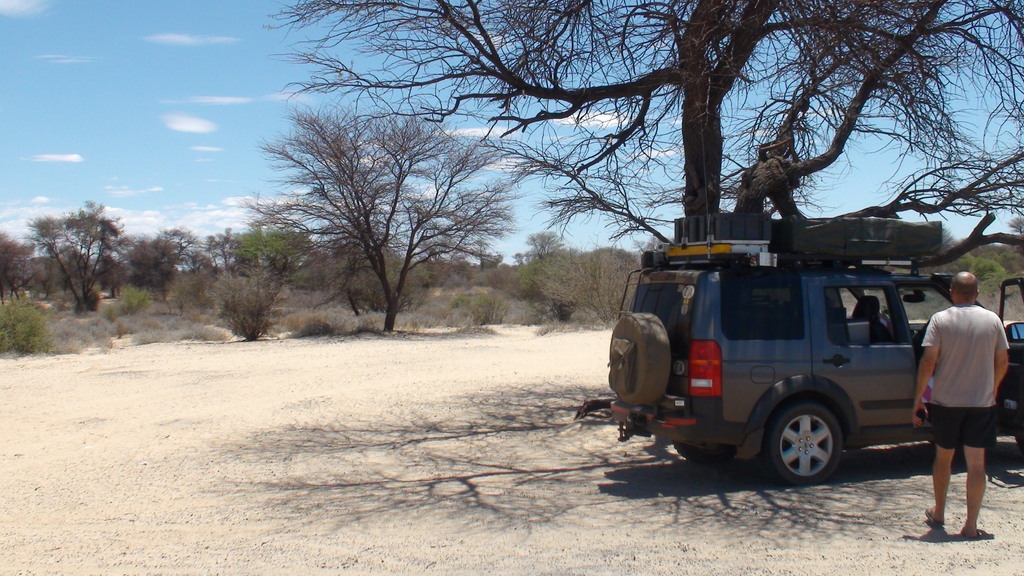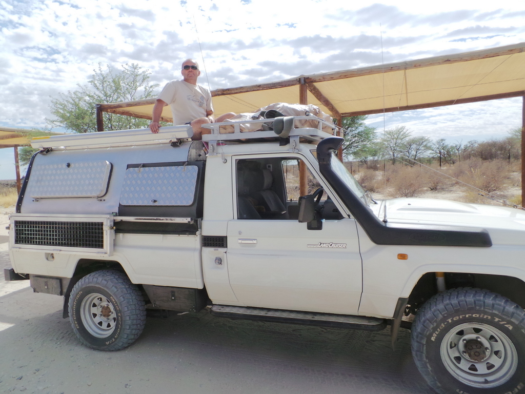 Phillip had to sit on the roof , as we slowly drove the 25 km to Nossob