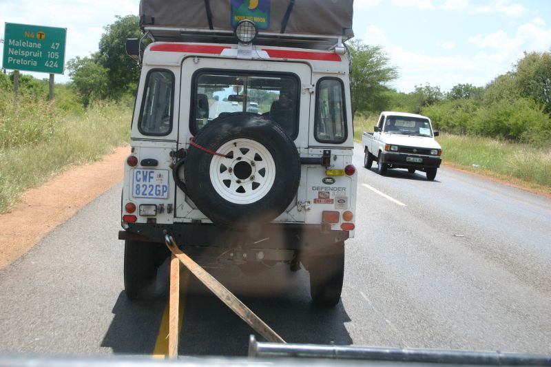 This was our last leg home and we were being towed! There were some stressful towing moments; two breaks in the tow rope, stopping in main intersections to tie knots in hectic traffic but we managed to safely get through Maputo. We reached the Komatipoort boarder gate at 11h30 with the temperature at a scorching 43 degrees. We said goodbye to our helpful 90 compatriots at the Engen One Stop in Komatipoort and awaited the arrival of our next savior. By 13h10 we were now staring into the back of Eric’s white 110.