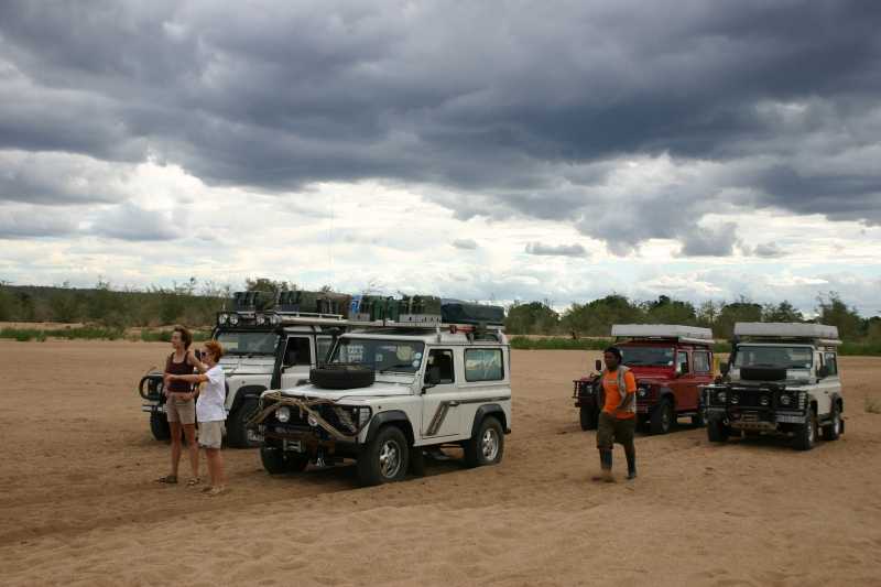 By 05h20 the fumes from 2 diesel landies and the engine roar from our 110 had stirred up a couple of dogs in the neighbourhood. In the one 90 was Guy and Catherine and the other Sello and Mikah (Catherine’s friend from Germany). Our first stop was breakfast at Kranskop One Stop, just outside Potgietersrus. The next stop was Louis Trichardt, where in peak Saturday shopping traffic, we needed to find an auto/car shop because Sello forgot to get red triangles and these are a requirement for traveling in Mozambique. Catherine and Mikah ventured off to the local KFC whilst the guys looked for triangles and returned all weary eyed. The KFC experience for Mikah was rather different in this very busy “plaas” town, as she flew in from Germany just the previous day to join us on our overland Landy experience. Our next destination is the Kruger National Park, where we meet up with Neville and Gerlinde, also in a 90, only it’s red. Neville is Guy’s dad who has come up from Cape Town, also to join us on the trip. We made the Pafuri border control with only half an hour to spare at 15h30, hoping it gave us enough time to get through on the Mozambique side as well. All went very smoothly on both side. Six cerveja’s (beers) to the border control guys, purchased all the Meticais they had, which was not nearly enough, and we were officially in Mozambique. Dirt roads ahead we headed for the Limpopo River, hoping to make a crossing. All excited to see the river,